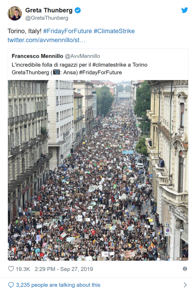 Ieri, 27 settembre 2019, c’è stato il terzo sciopero per il clima e il numero di persone che si è presentato per sostenere il movimento di Friday for Future ci ha sorpreso e commosso. Più di cinquantamila persone hanno invaso le strade di Torino per chiedere alla politica italiana di cambiare l’agenda climatica. Ho raggiunto al telefono Roberta, attivista del collettivo Extinction Rebellion, per sapere com’è andata.