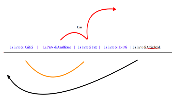 Il cortocircuito dell’infrarealismo si palesa nella struttura stessa di 2666, come schematizzato nella figura in basso, in cui le ‘parti’ in blu sono quelle che si svolgono a Santa Teresa, la linea arancione rappresenta l’arco narrativo di Amalfitano, la linea rossa quello di sua figlia Rosa e la linea nera quella di Arcimboldi.