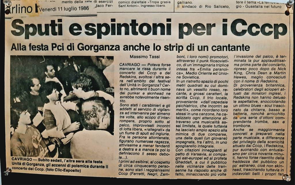 Il pubblico ascolta in religioso silenzio ma freme, ansioso di immergersi nell’esperienza musicale imminente. Poi, un’onda sonora. “Emilia Paranoica”, il primo brano, prende forma sul riff di Zamboni. Ferretti è immobile e ferreo sotto un cono di luce. Fatur si agita stretto nella morsa di una gogna di metallo. La melodia è incalzante, le batterie e i violini fanno il resto. Una combinazione di suoni elettronici e strumenti tradizionali crea un’atmosfera avvolgente. Sono proprio loro, i CCCP, l’ultima avanguardia del Novecento.