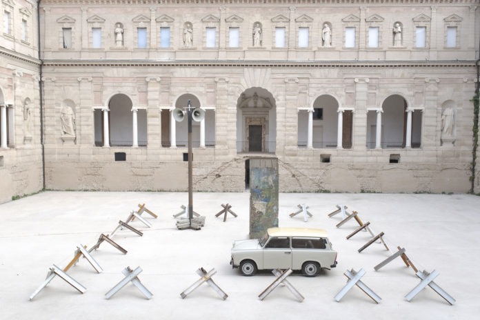 È un ottobre diverso, più meccanico, ugualmente grigio, ma questa volta io sono un’altra persona, a Reggio Emilia ci arrivo così, tra lo stupore e il basito, perché non credevo che si potesse portare quei quattro debosciati in un chiostro che non fosse “ortodosso”. E non a torto. Già dagli spazi esterni, allestiti per l’inaugurazione, troviamo la scritta “Felicitazioni!” con davanti le sagome metalliche dei tre Vopos di Berlino. La mostra si sviluppa su tre piani e al piano terra troviamo sette sale affrescate. Sette, come gli album usciti. In ogni sala, sono allestite atmosfere completamente diverse l’una dall’altra, che riprendono la storia del gruppo. Gli stessi CCCP hanno avuto un ruolo fondamentale nella curatela della mostra, in particolare Annarella, che ha conservato i vestiti di scena e i poster originali, insieme a Stefania Vasques, a cui va il merito dei grandiosi allestimenti.