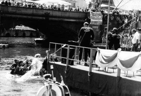 La data fondamentale è il 4 aprile 1984. Quel giorno nel Palazzo della Provincia di Corso Monforte, a Milano, va in scena la conferenza stampa di presentazione de “Le Bande Giovanili: una realtà nella metropoli degli anni ’80” una indagine sociologica sui movimenti controculturali (punks, mods, metallari eccetera) redatta da sociologi legati al PCI e commissionata tra l’altro da un ente che lavorava sulla criminalità, che aiutava la polizia. Insomma ‘sta cosa di venire “analizzati” ci sta sui coglioni, e quindi decidiamo di andare a contestarli, e a noi si uniscono per la prima volta gli universitari che finalmente si stavano svegliando dopo il grande sonno che dal ‘78 fino all’84 aveva subito l’università. Ebbene, ci incontriamo e facciamo faville. Oltre a contestare la conferenza, a prenderli per il culo, ci tagliamo il petto con delle lamette e sporchiamo di sangue dei volantini che recitavano: “Questo è il nostro sangue, analizzatelo, scoprirete i nostri veri bisogni”. Il giorno dopo ne parlano tutti, e noi sempre per contestare i sociologi il sabato successivo occupiamo per una sera il Teatro di Porta Romana. Insomma, alleandoci con gli studenti di filosofia, di sociologia spacchiamo. Poi poco dopo arriva lo sgombero del Virus, e gli studenti arrivano a darci una mano contro la repressione. Incomincia un legame importante fra punx e studenti che sarà poi al centro dei fatti che racconto in Pirati dei Navigli.