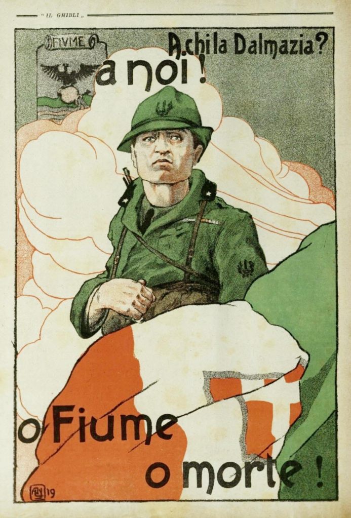 Mentre fissa quelle parole sul volantino, la mente di Marco vola a un’altra città che ha vissuto ferite simili. Fiume – oggi Rijeka – sull’Adriatico. Nel 1919 Fiume fu occupata dal poeta-soldato Gabriele D’Annunzio e dai suoi legionari. D’Annunzio si proclamò comandante di quella città contesa, per sedici mesi governò da padrone, tra parate sfarzose e proclami visionari, mescolando patriottismo e stravaganze libertarie. Quel teatro politico anticipò in parte il nascente fascismo, anche se D’Annunzio ammantava tutto di una retorica di libertà e modernità.