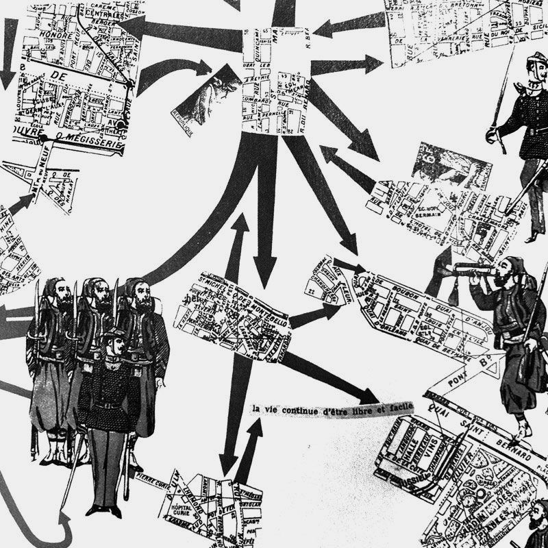 Come riportato da Leonardo Lippolis in Viaggio al termine della città (elèuthera, 2009) L’Internazionale Situazionista (IS), fondata da Guy Debord, Raoul Vaneigem e altri negli anni ‘50 del Novecento, fu l’ultimo tentativo delle avanguardie di trasformare le città per rivoluzionare l’intera vita sociale. Questo è stato il principio di fondo dell’urbanismo unitario teorizzato e sperimentato dall’IS tra gli anni Cinquanta e Sessanta. Osservando come l’architettura brutalista marxista aveva contribuito ad assoggettare la popolazione in percorsi sempre uguali tra casa e lavoro, i lettristi prima e i situazionisti poi cercarono di sovvertire il tempo organizzato dal capitalismo in rapporti di produzione-consumo.